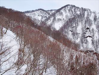 大石岳 14いきなり急登から始まりシンドイ…。 あまりに傾斜が強過ぎて、しかも雪解けの ザクザク雪のため、スノーシューで登るも ズリ落ちてしまうのです。 まるで蟻地獄状態に辟易しました。2017年4月6日撮影 |
