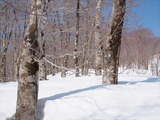 大石岳 23山頂手前の尾根では立派な ブナ林に感動した次第です。2017年4月6日撮影 |