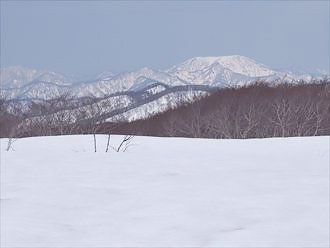 大石岳 22遠方に秋田駒ケ岳の雄姿が望めます。 山頂付近は広々とした雪原で秋田駒ケ岳や 和賀山塊の山々を一望できました。2017年4月6日撮影 |