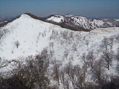 大薊山 36大薊山の山頂手前1100m付近より、昨日登った孤狼化山と、その奥に鳥海山(2,236 m)を望みます。2019年4月29日撮影 |