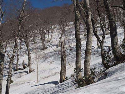 桑原岳 16標高910mにて南斜面を望みます。この先、さらに傾斜がきつくなります。特に標高920mからP1037は「壁」って感じで、アイゼンが欲しい感じの斜度です。2019年5月4日撮影 |