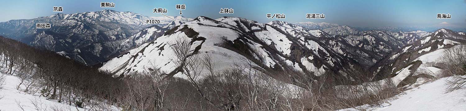 桑原岳 23P1037付近より撮影。左より焼石岳(獅子ヶ鼻岳)、天竺山、経塚山、駒ケ岳を望みます。このP1037からの展望は最高です!2019年5月4日撮影 |