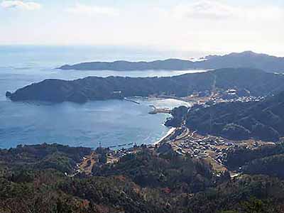 鯨山(くじらやま) 14手前から船越湾、吉里吉里半島、大槌湾、箱崎半島です。右奥に見えるのがカモメ森山(325m)です。中央右に浪板海岸も見えます。2025年12月7日 |