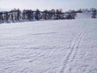春子谷地と鞍掛山 3歩き出してすぐ、空一面の青。広大な牧場の雪原は朝の冷気でカチコチに締まり、まるで舗装路のような歩きやすさです。雪を踏みしめる音だけが響く静かな世界に、自然と気持ちも軽くなります。2026年3月1日撮影 |