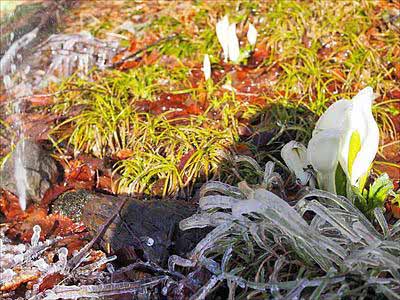 八幡平 源太ヶ岳 4噴き出た水が凍り、付近の水芭蕉迄凍っていました。まるでガラス細工のような水芭蕉に感激!2026年4月25日撮影 |