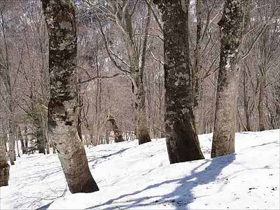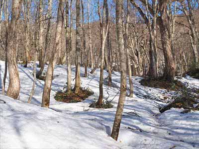 八幡平 源太ヶ岳 24下山は5年前と同様、P1146より積雪期限定の南東尾根(近回り)を下りました。かなり時間短縮できます。ブナ林にいされます。2026年4月25日撮影 |