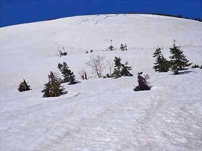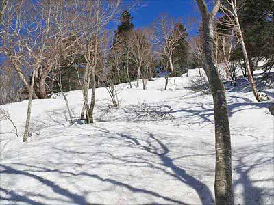 八幡平 源太ヶ岳 15写真では傾斜が緩く見えますが、実際は急です。慎重にトラバースします。強いて言えば、ここが核心部かも?2026年4月25日撮影 |