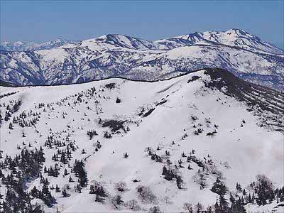 八幡平 源太ヶ岳 23左から茶臼岳~恵比須森~大黒森~屋棟岳~西森山~前森山です。2026年4月25日撮影 |