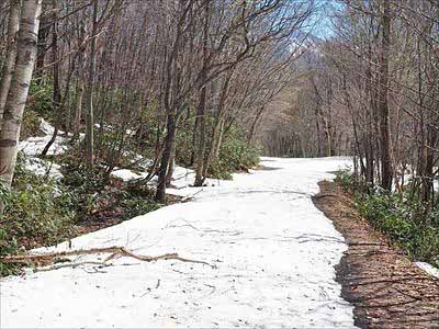 八幡平 源太ヶ岳 25林道に到着!大幅に時間短縮できました。林道に出る手前10mほどヤブ漕ぎを強いられましたが、あとは雪が続いていました。2026年4月25日撮影 |