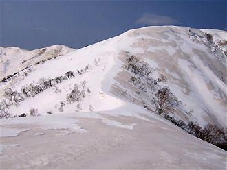 これが本当の大荒沢岳のピークです。 結構な急傾斜です。雪の状態が安定 していたので、ダイレクトに登りました。