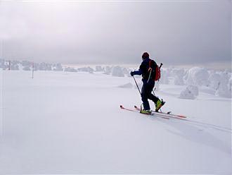 秋田 八幡平 14ひたすら広大な雪原…こんなところで 吹雪かれホワイトアウトになったら… でも、今回は目印(赤布)があったので とても安心できました。2009年2月11日撮影 |