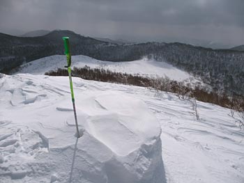 お寒い中、1時間以上も待ってて下さったようで恐縮です(^^ゞ。山頂付近の樹氷は圧巻で見事でした。まるで夢の世界を歩いているようでしたよ♪幻想的でウットリ~!驚いたことは、積雪量の少なさです。下界は雪が多いのですが、山(八幡平)は去年ほど多くなかったのです。っていうか、去年より明らかに少ないです。樹氷も落ちかかっていましたし…。スキーが超下手な私にとって、登りより下りの方が核心部なんです。曲がったことが大嫌いな私は(というよりターンが出来ないので)、直滑降勝負!男子たるもの、直球勝負!傾斜が緩く深雪の斜面にラインを見定め(スピードが出ない斜面を探し)、一直線勝負!「曲がるとき(ターンするとき)が転ぶとき!」との覚悟で滑っています。八幡平くらいの緩斜面ですと、スキー下手な私でも、結構楽しく滑れるようです。