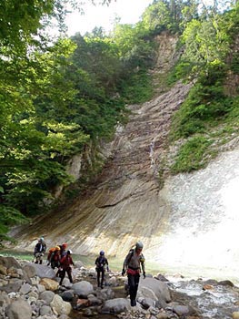 葛根田川同様、エメラルドグリーンの美しい水に白いナメ床が続き、かと思えば、美しい釜や淵、そして小滝も随所に現れ、まったく飽きさせない秀渓でした。「それにしてもMさん、働き者だなぁ~!」と感心しました。小屋では料理作りの補助をし、沢ではテキパキとザイル操作を行う好青年です。若手ゆえ、盛岡山友会さんの将来を担う貴重な人材に育っているようで嬉しく思いました。沢登りをする若者が少ない中、岩手全体で見ても貴重な人材なのだと思います。今後のご活躍を期待しています。