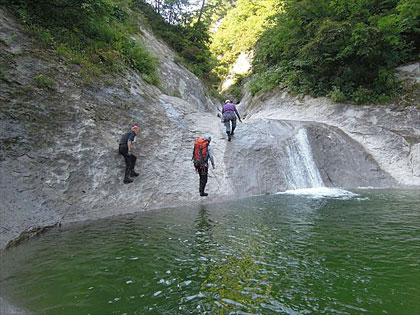 沢床へ降りて遡行を続けますが、次から次へと嫌らしいボルダーチックなテロテロ系の滝が連続します。ザイルを出して登ったりザックの荷揚げをしたりで、その対応に忙しく時間ばかりが経過します(5人全員通過するのに多大な時間を要した)。「このペースだと明るいうちに小屋に辿り着けないかもしれない、もしやビバークか…」と不安が頭をよぎります。それ以降は、登るのに時間が掛かりそうな困難な滝が出てきたら、無理に登らず高巻く方針に切り替えました。