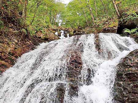 歩き始めて1時間ほどで、キラキラと輝く「6mの滝」が出現。中央の岩肌を快適に登っていくと、その先にはなんと70mも続く長大な「ナメ床」が!滑らかな岩肌を清流が流れ落ちる様はまさに癒しの光景で、沢歩きの醍醐味がここに凝縮されていました。