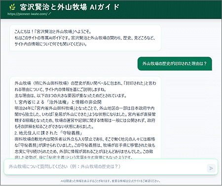 そして、今回の最大の挑戦がAIガイド(チャットボット)の導入です。「外山牧場はどうやって始まったの?」「宮沢賢治はここで何を見て、何を考えたの?」「軍馬と岩手の関係を知りたい」——そんな疑問を、検索ではなく“会話”で投げかけてみてください。AIが2つのサイト全体を瞬時に読み取り、要点をかみ砕いて答えてくれます。まるで、あなた専属の歴史コンシェルジュが側にいる感覚です。